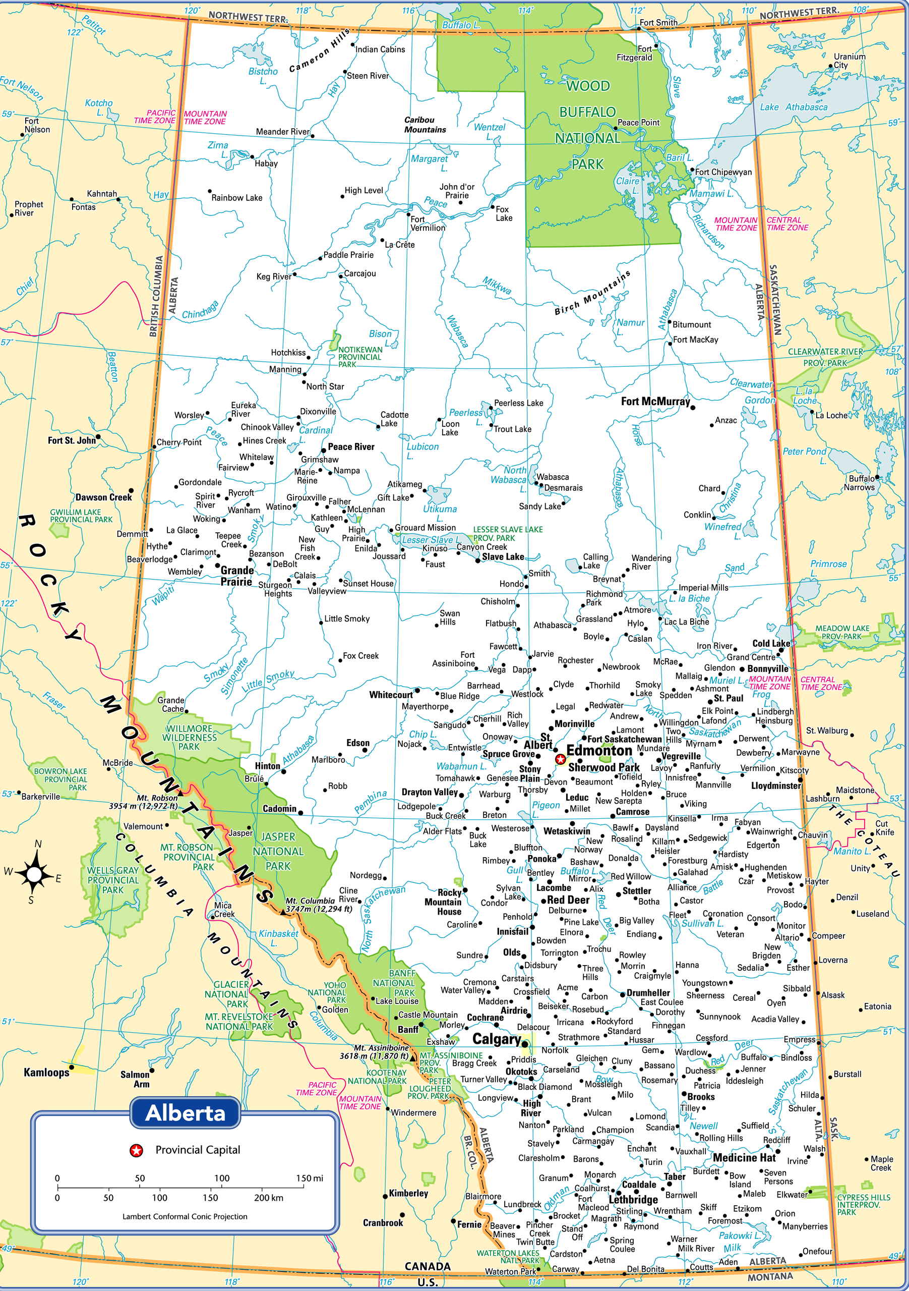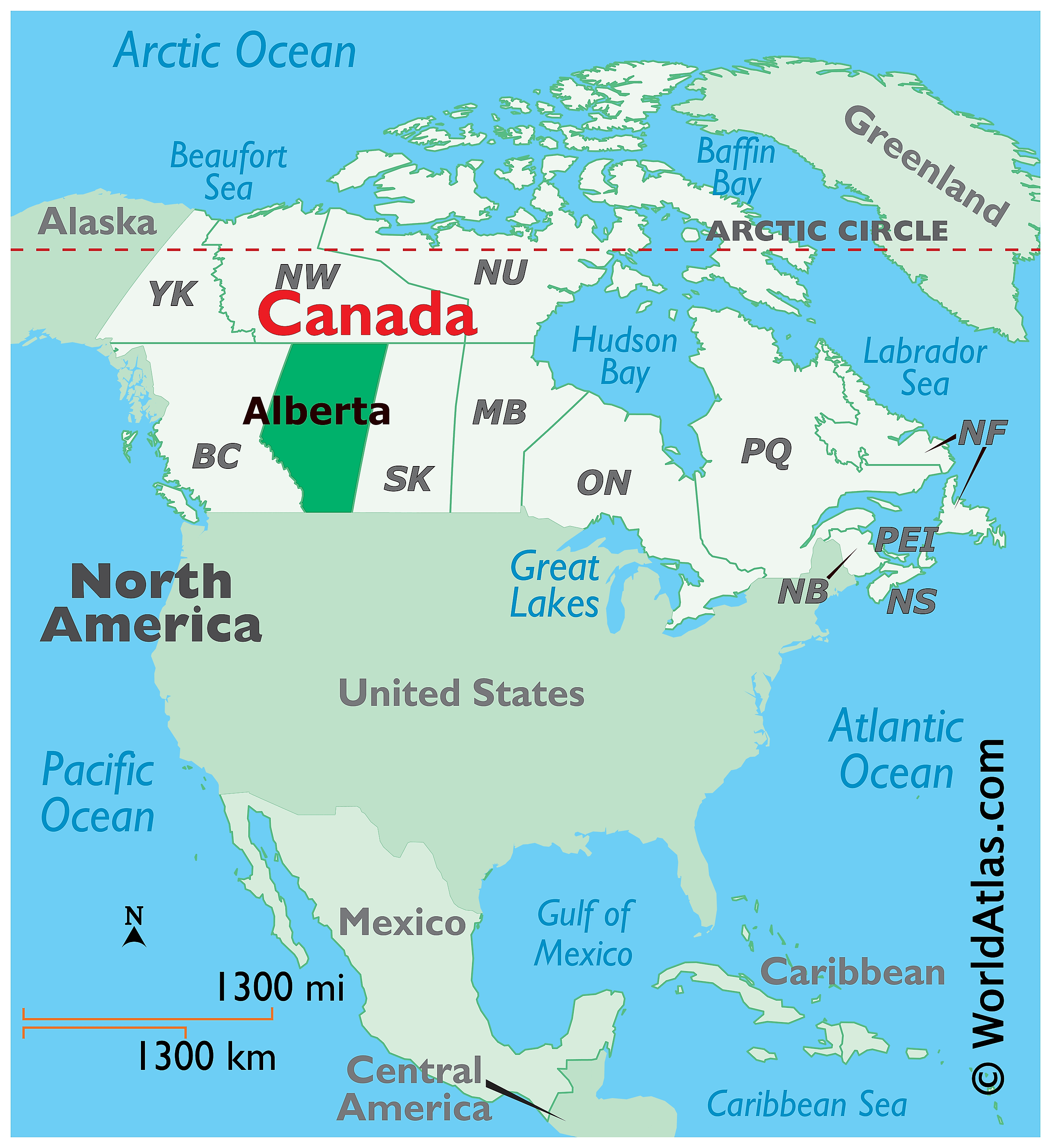 The Province of Alberta is located in the west-central part of Canada, in the Continent of North America. It is geographically positioned in the Northern and Western hemispheres of the Earth. Alberta is a landlocked province that is situated in the Prairies region of Canada. It is bordered by the other Canadian Provinces of British Columbia in the west; by the Northwest Territories in the north; and by Saskatchewan in the east. In the south, the 49th parallel north latitude forms Alberta’s international boundary with the US State of Montana.