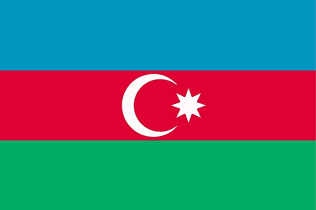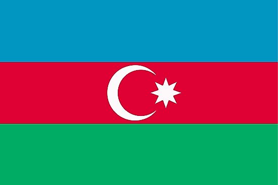 The Azerbaijani flag is rectangular and features three equal horizontal bands: sky blue (top), red (middle), and green (bottom). There is also a vertical crescent moon and a star with eight points, both in white; featured at the center of the red stripe. The sky blue color of the flag recalls Azerbaijan's Turkic heritage and represents Turkic multinationalism. The red color symbolizes the development of democracy in the nation and stands for modernization and progress for establishing a modern state. The green color symbolizes the strong influences of the religion of Islam (Muslim world) on the country. The star and the crescent moon represent Islam (Turk Insignia), although some historians disagree with this notion, especially in regards to the star’s eight points. Historian, Fatali Khan Khoyski claimed the points represent every letter on the country’s name (using an Arabic spelling), while others believe they represent Azerbaijan’s eight Turkic groups, including Ottomans, Tatars, and Azeris. The height to length proportions of the flag is 1:2.