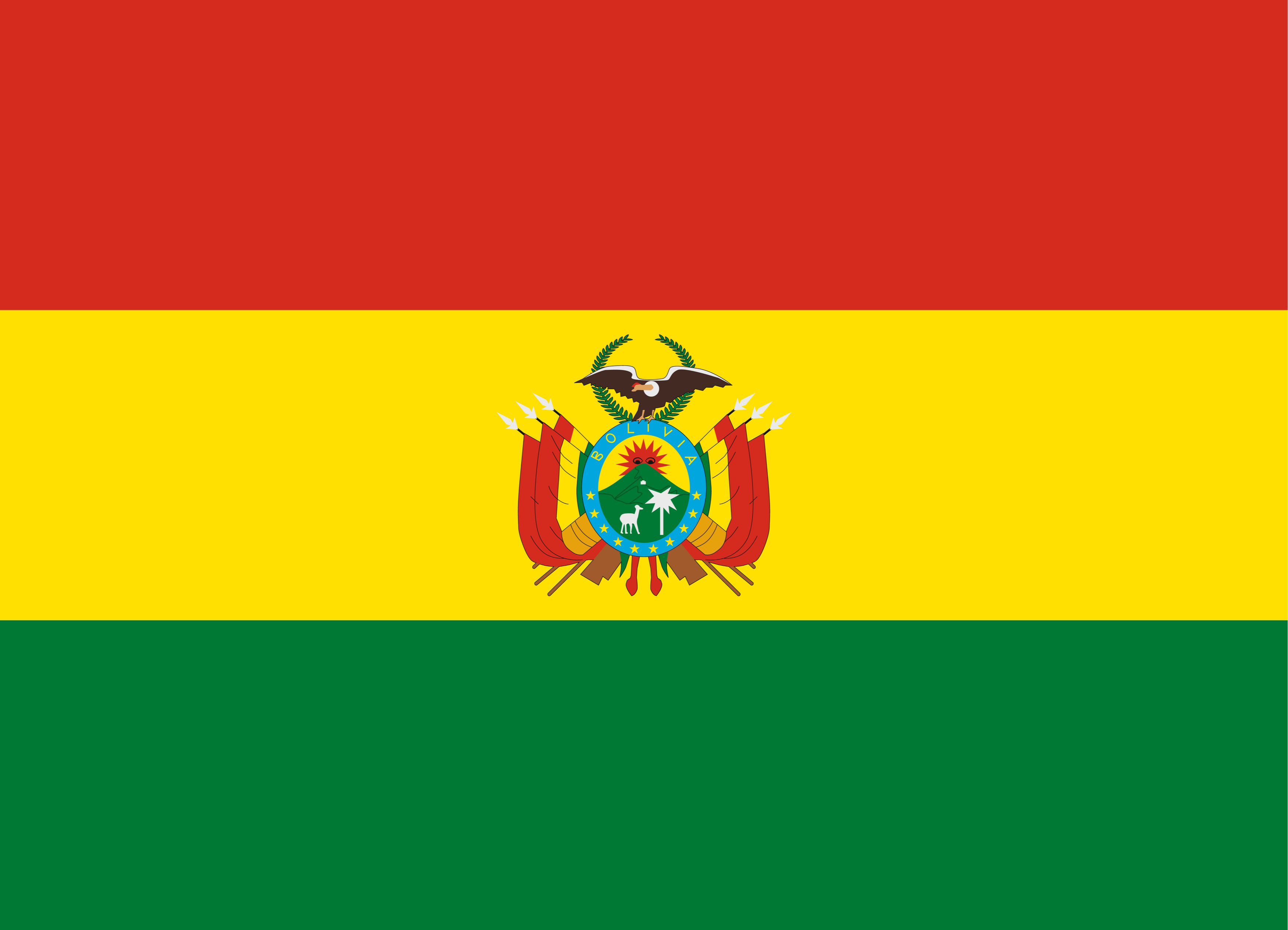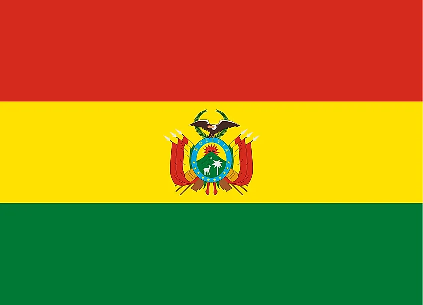The national flag of Bolivia features three equal horizontal bands of red (at the top), yellow (in the middle), and green (on the bottom) with the Bolivian coat of arms featured on the yellow band at the center of the flag. The red color represents bloodshed and the bravery of those who lost their lives in the quest for independence and sovereignty of Bolivia; the yellow color represents the country’s wealth and mineral deposits, while the green color represents the richness of the country’s agriculture and natural areas. It also symbolizes hope – the foundational value of society. The flag has a width-height proportion ratio of 2:3.
