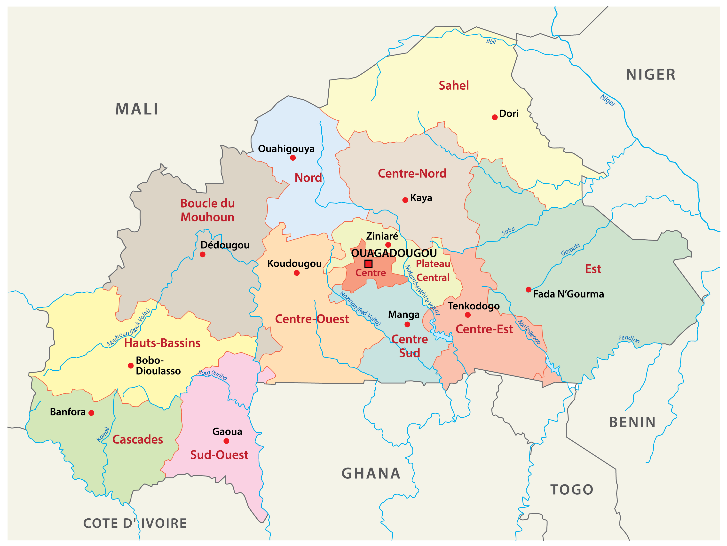 The 13 regions are; Boucle du Mouhoun, Cascades, Centre, Centre-Est, Centre-Nord, Centre-Ouest, Centre-Sud, Est, Hauts-Bassins, Nord, Plateau-Central, Sahel, Sud-Ouest. With an area of 46,694 sq. km, Est is the largest region while Centre is the most populous one. Ouagadougou, the national capital city, is also located in the Centre Region.