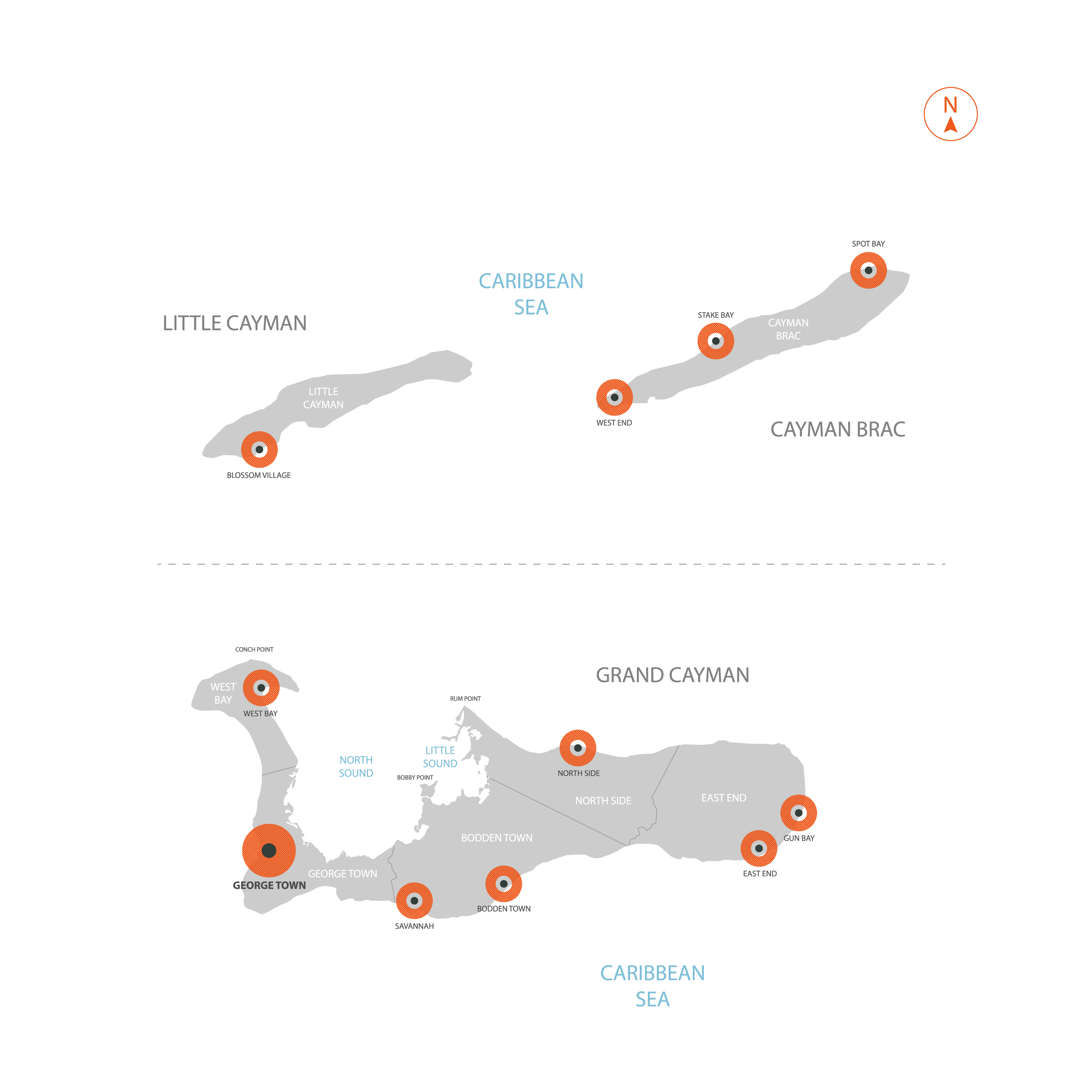 The British Overseas Territory of Cayman Islands is administratively divided into 6 districts. These districts are Bodden Town, Cayman Brac and Little Cayman, East End, George Town, North Side, and West Bay.