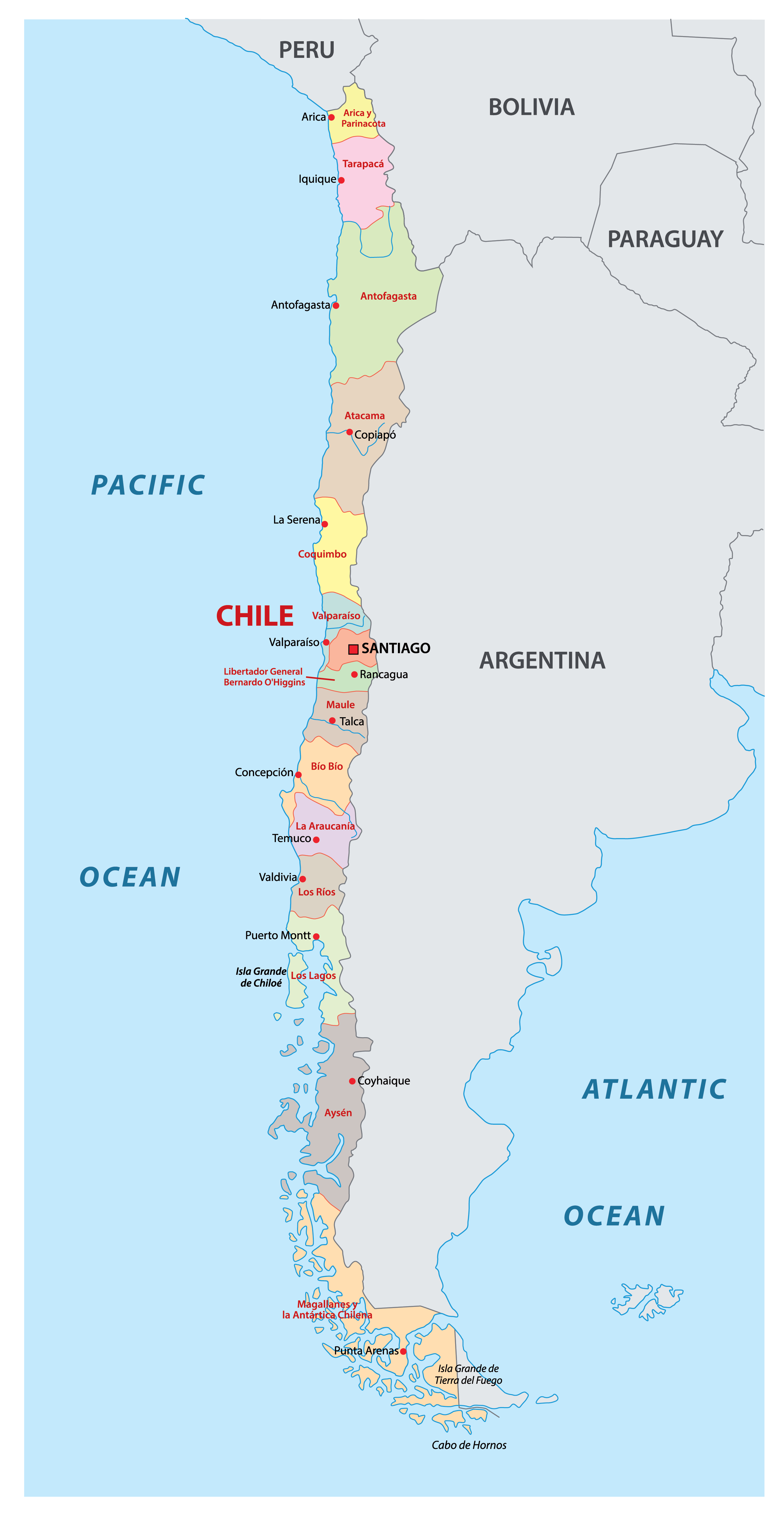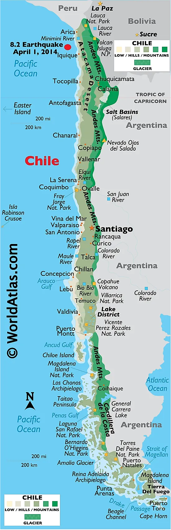 Chile is a country located in the southwestern part of South America. It is geographically positioned both in the Western and Southern hemispheres. Chile occupies a long, narrow coastal land strip wedged between the Andes Mountains to the east and the South Pacific Ocean to the west. It is bordered by Peru to the north; by Bolivia to the northeast; by Argentina to the east and by the Drake Passage to the south.
