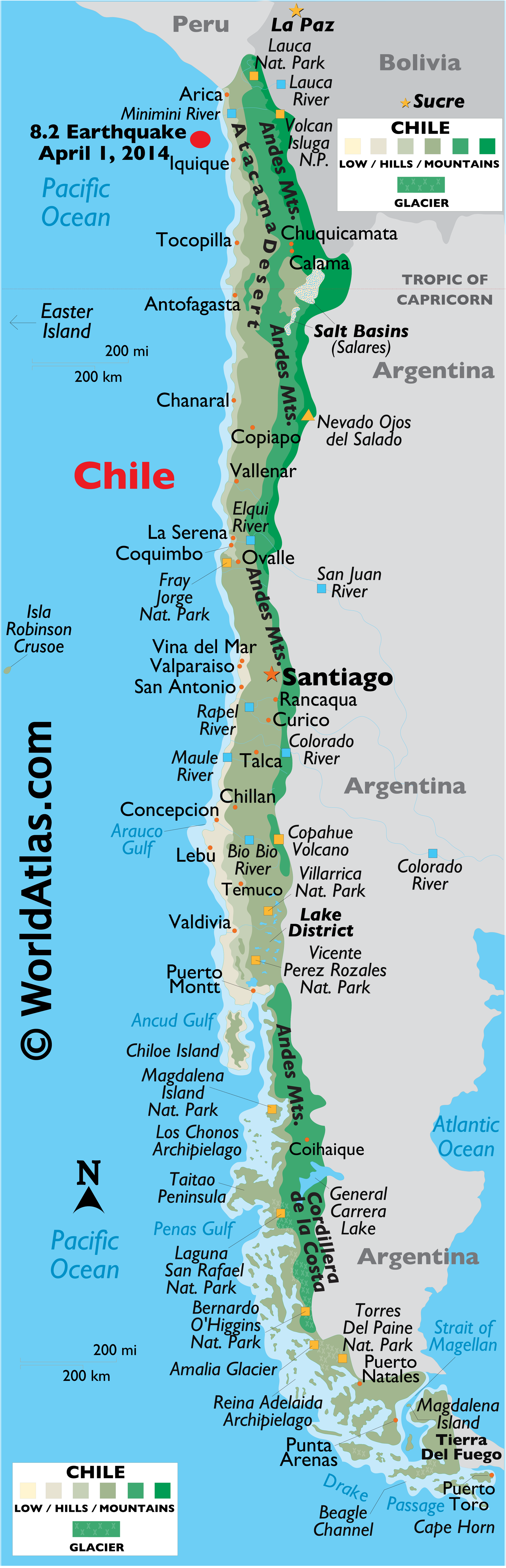 Physical Map of Chile showing relief, rivers, mountains ranges, major lakes, important cities, bordering countries, and more. Easter Island Easter Island