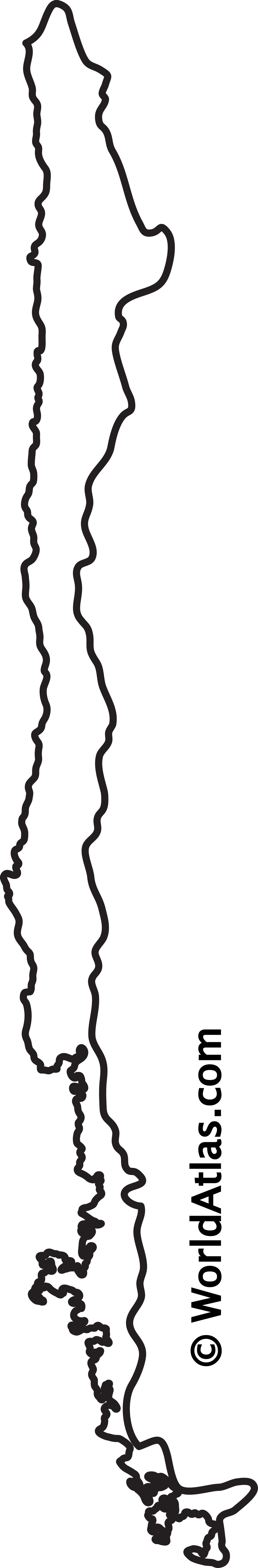 The above outline map represents Chile, a long narrow country located in the southwestern part of South America. The country has an unusual, ribbon-like shape, with a long toothy coastline.