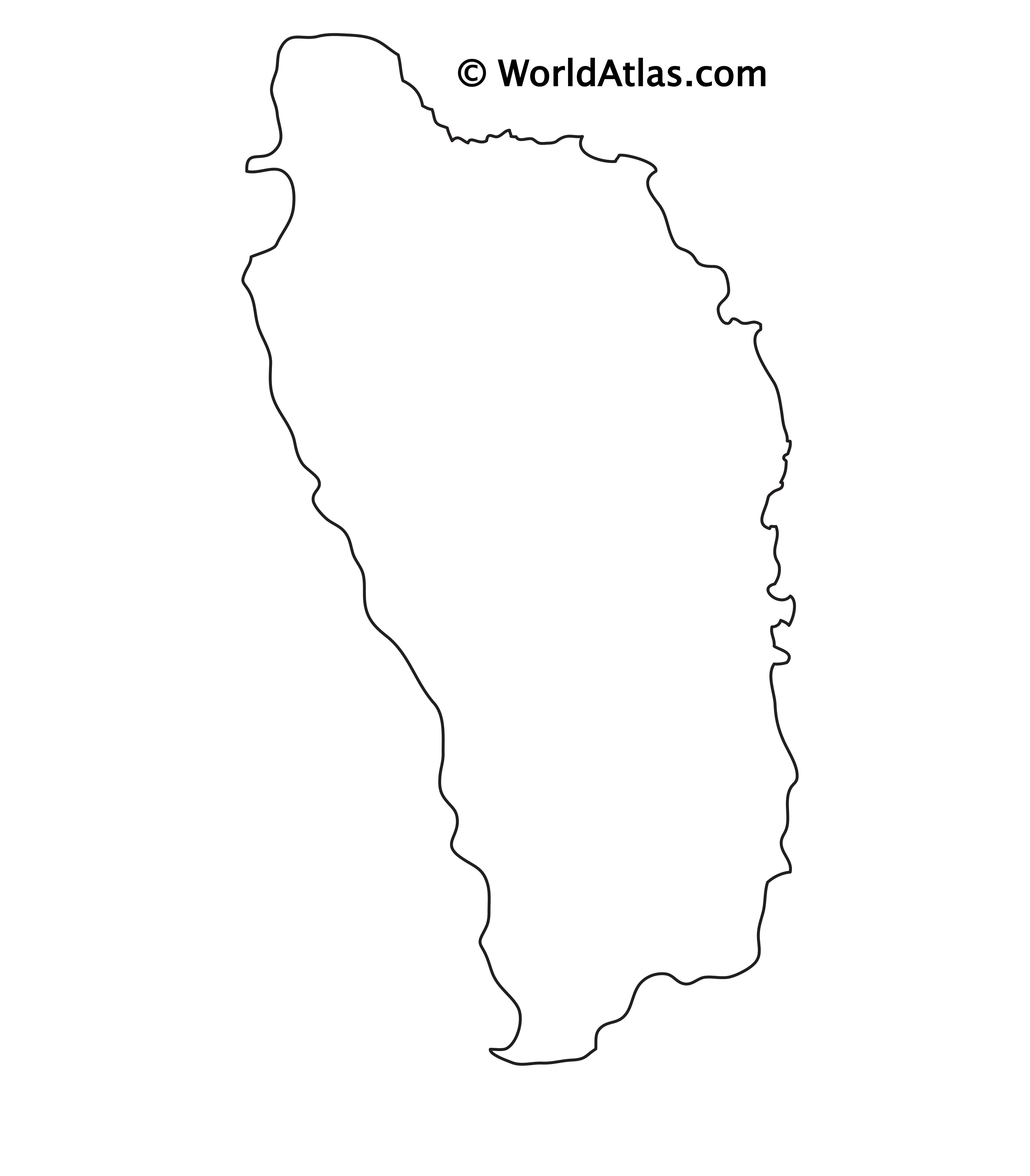 The above blank map represents Dominica, an island nation in the Caribbean Sea. The above map can be downloaded, printed and used for educational purposes.