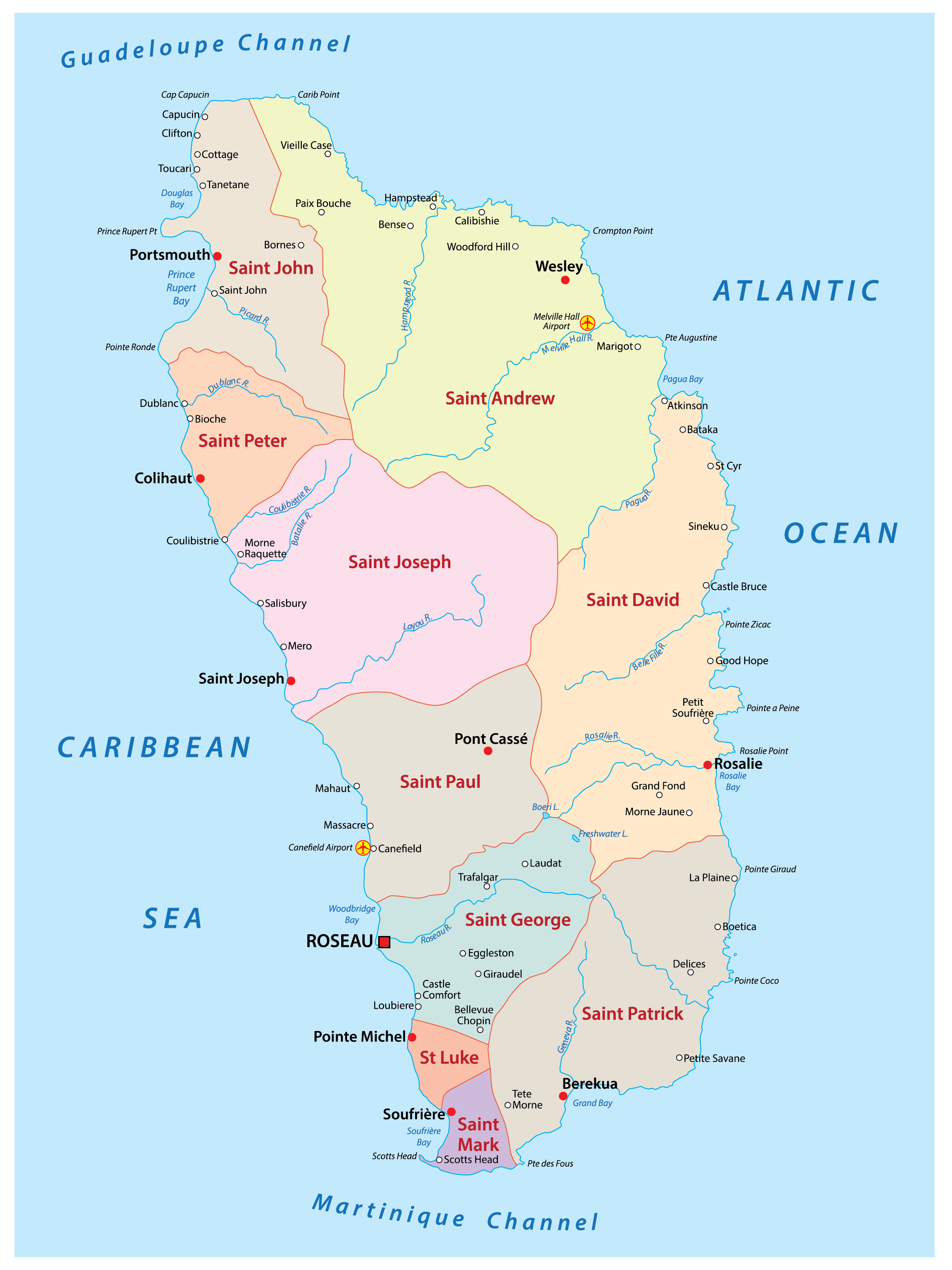 Dominica (officially, the Commonwealth of Dominica) is divided into 10 parishes. In alphabetical order, the parishes are: Saint Andrew, Saint David, Saint George, Saint John, Saint Joseph, Saint Luke, Saint Mark, Saint Patrick, Saint Paul and Saint Peter.
