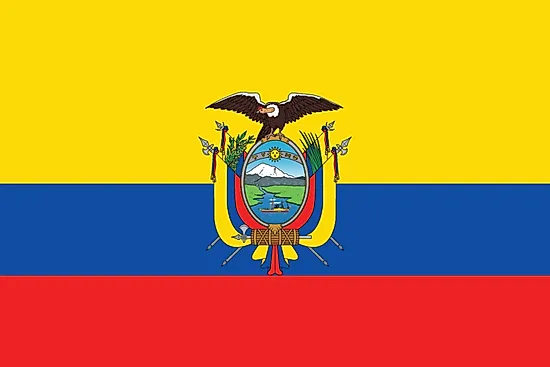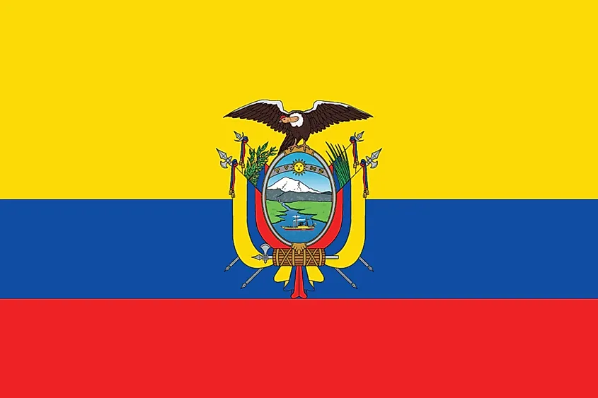 The National Flag of Ecuador features three horizontal bands of yellow (top, double-width), blue, and red; with the coat of arms superimposed at the center of the flag. The yellow color represents sunshine, grain, mineral wealth, and fertile soil. The blue color symbolizes the sky, sea, and rivers. The red color represents the blood of patriots spilled during the struggle for freedom and justice. The flag has a length-to-width proportion ratio of 2:3.