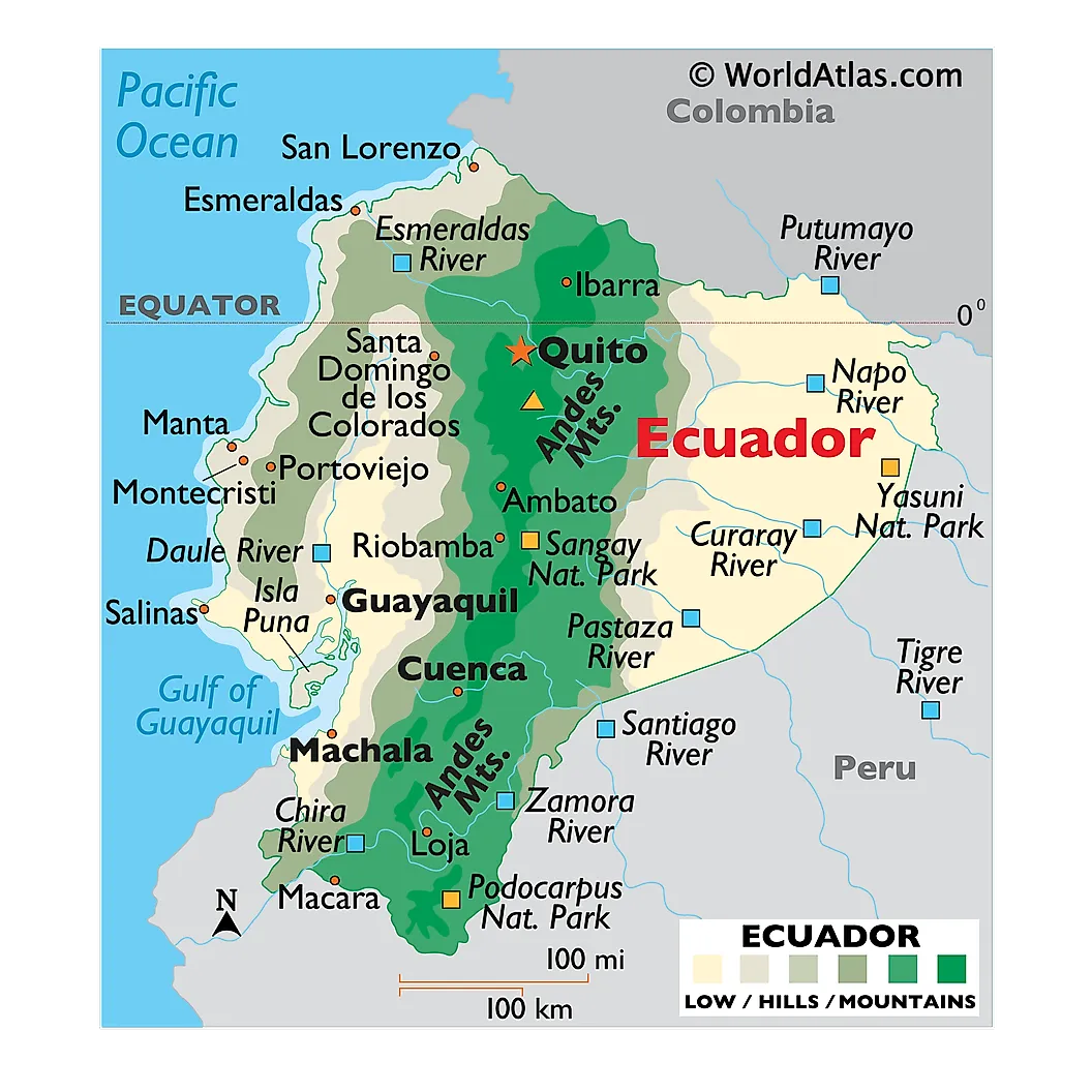 Ecuador occupies a total area of 283,561 sq.km, which also includes the Galapagos Islands. Located in the north-central part of the country in the Andean highlands is, Quito - the national capital and the second most populous city of Ecuador. Situated at an elevation of 9,350ft, it is the world's second highest capital city and the oldest among all the South American capitals. It is the administrative and cultural center of Ecuador. Guayaquil is the largest and the most populous city in Ecuador. It is also a major commercial hub and a port city, where most of the economic trade is conducted through the Gulf of Guayaquil.