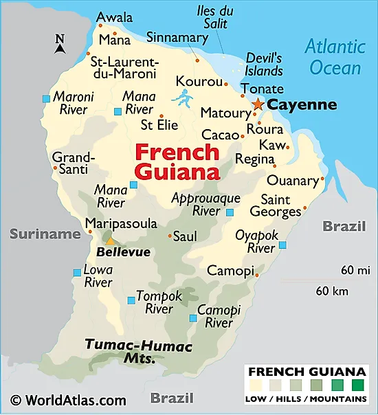 French Guiana is an overseas region and department of France that is located in the northeastern edge of South America. It is geographically positioned in the Northern and Western hemispheres of the Earth. French Guiana is bordered by Brazil in the east and south; by Suriname in the west and by the Atlantic Ocean in the northeast.