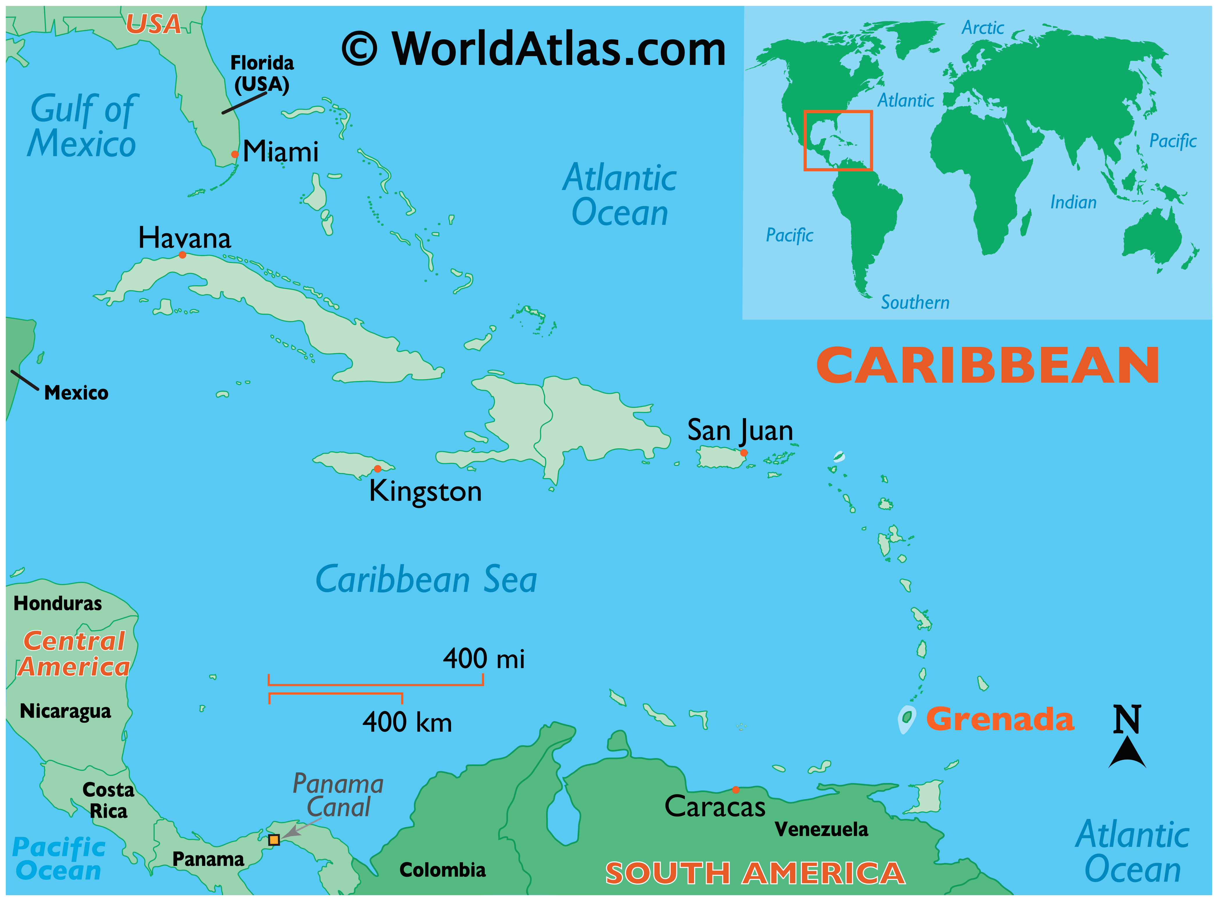Grenada is an island nation located between the Caribbean Sea and the Atlantic Ocean, occupying the southernmost part of the Grenadines chain of islands. It is positioned both in the Northern and Western hemispheres of the Earth. Grenada is situated to the northeast of Venezuela; to the northwest of Trinidad and Tobago; and to the southwest of Saint Vincent and Grenadines.
