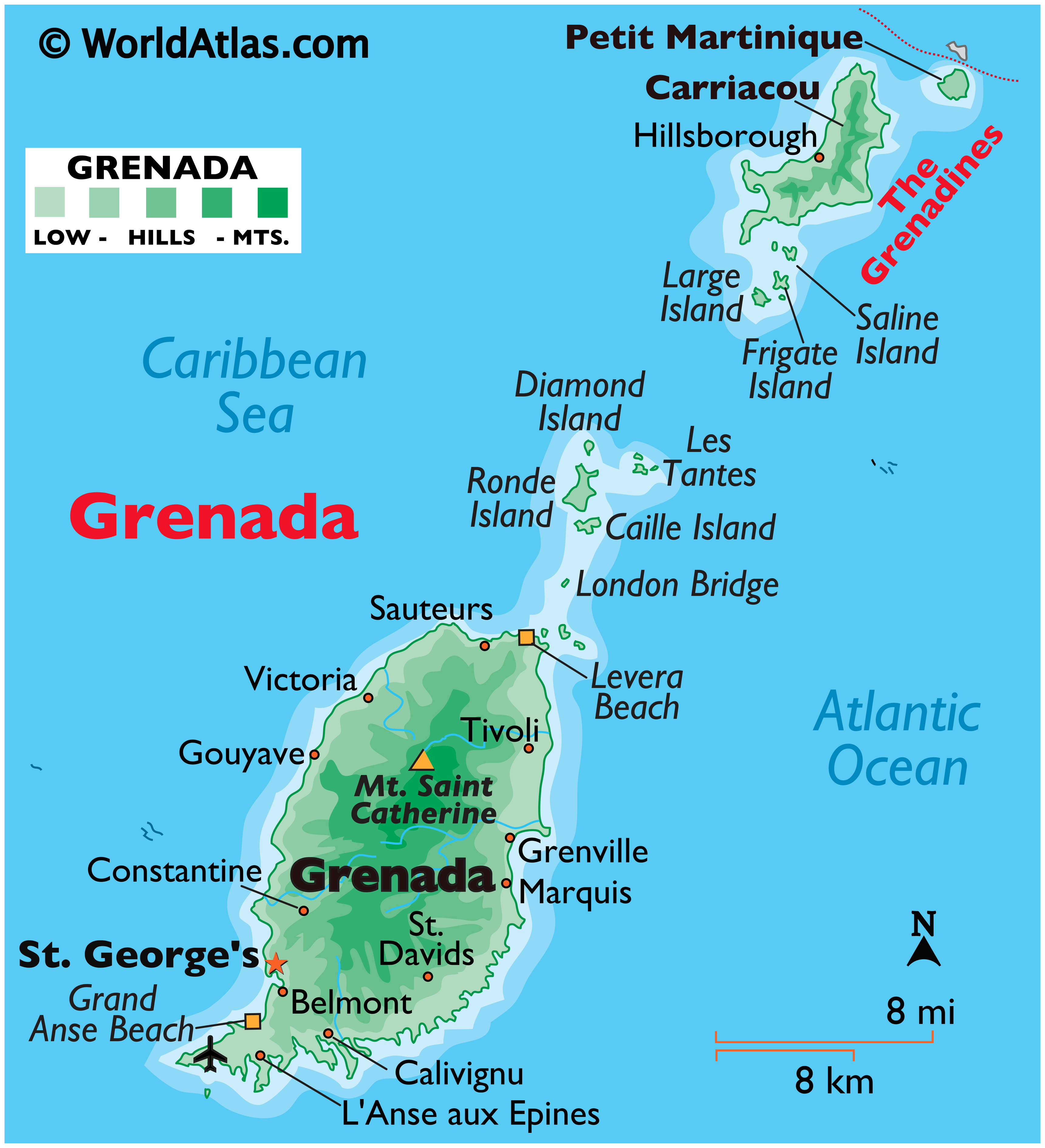 The above outline map represents Grenada, an island nation in the Caribbean Sea. The islands are of volcanic origin and are oval in shape, having a highly mountainous terrain.