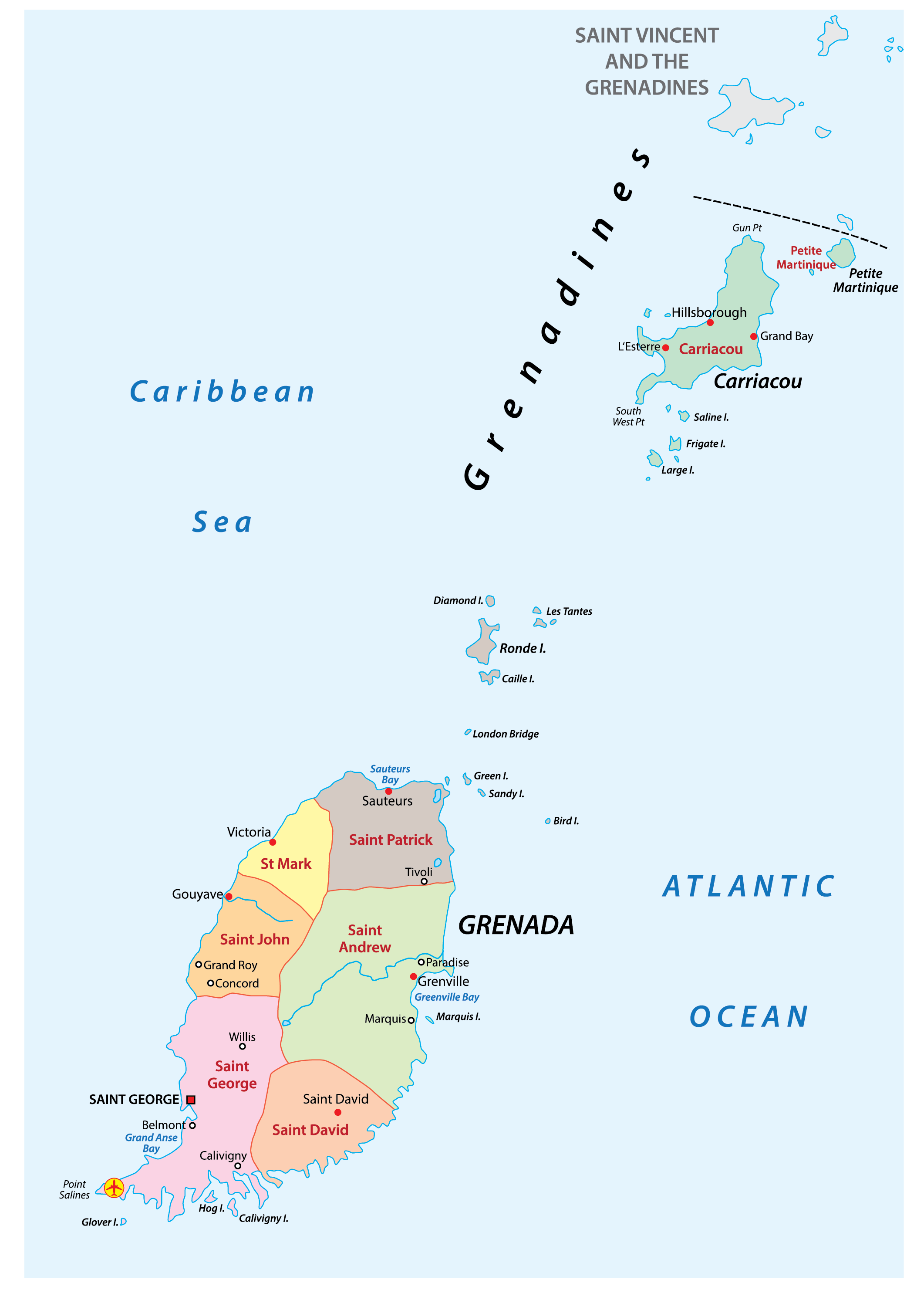 Grenada is divided into 6 parishes and 1 dependency. In alphabetical order, the parishes are: Saint Andrew, Saint David, Saint George, Saint John, Saint Mark and Saint Patrick. Carriacou and Petite Martinique have the status of a dependency.