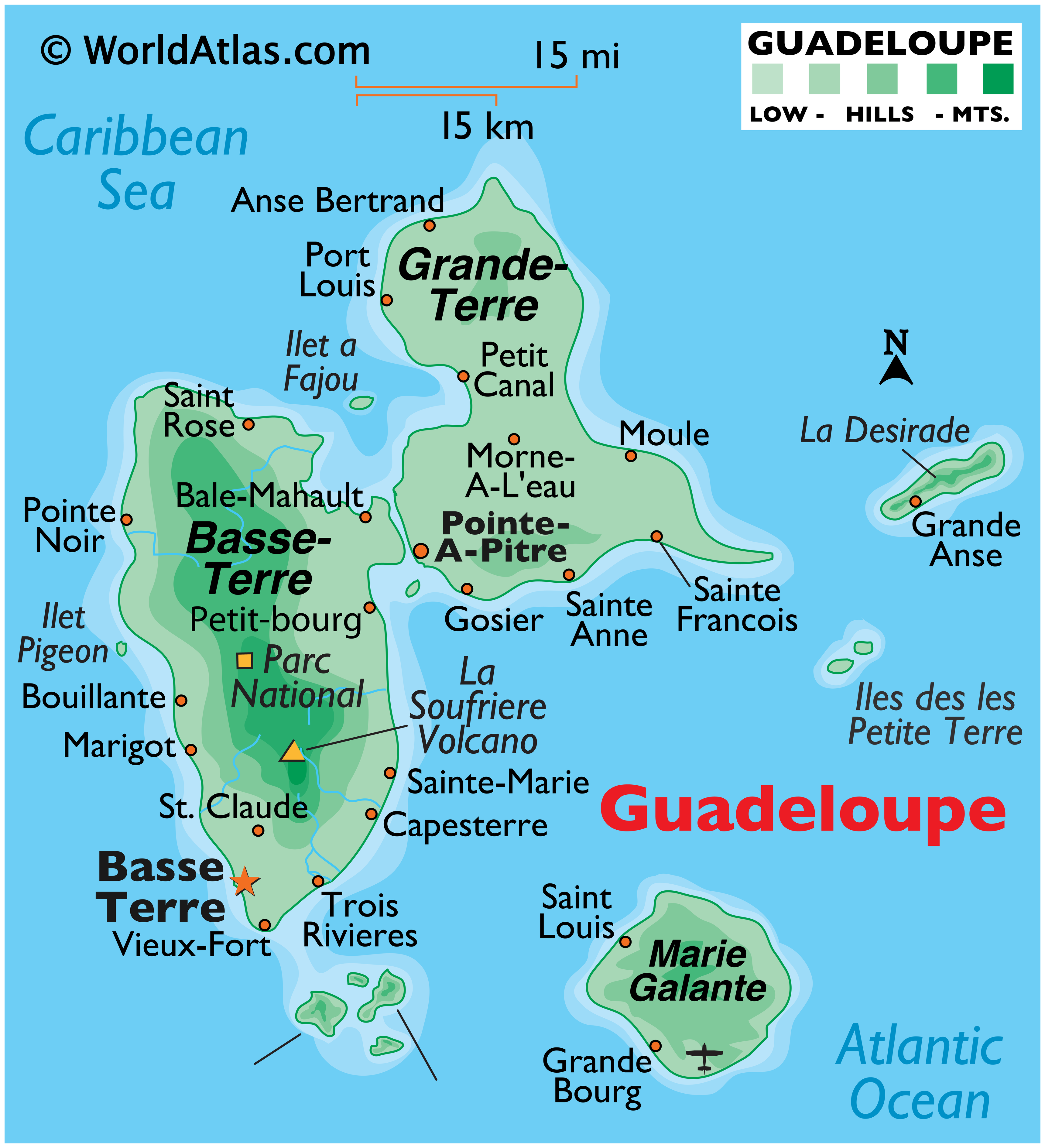 La Grande Soufriere an active volcano located on the main island of Basse-Terre is the tallest point in Guadeloupe. Standing at an elevation of 4,813 ft (1,467m), it is the highest point in the Lesser Antilles. As observed on the map, Basse-Terre island is slightly more mountainous and lush than its sister island and has plenty of forested areas