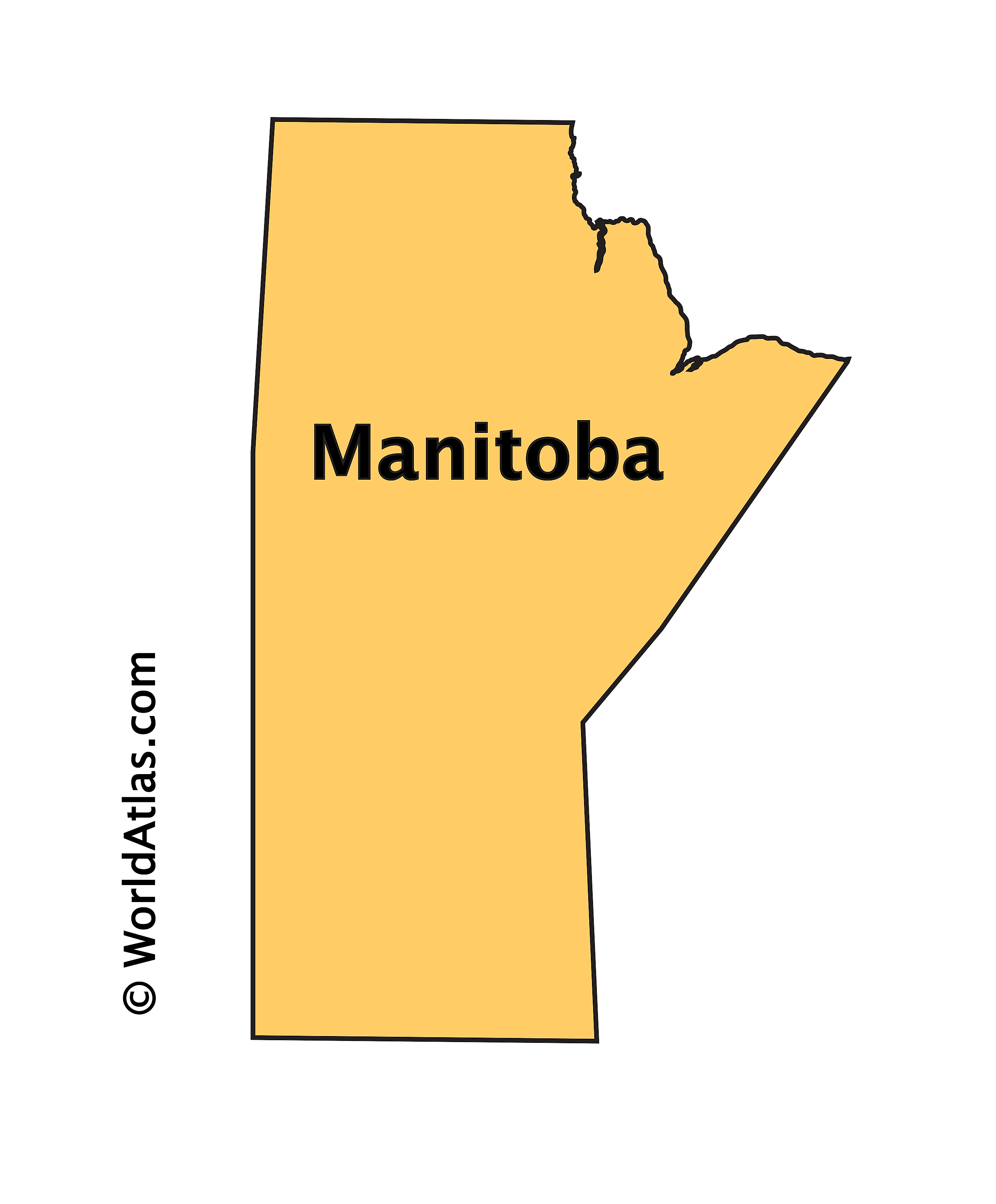 The above outline map represents the Province of Manitoba, located in the central part of Canada.