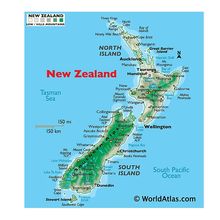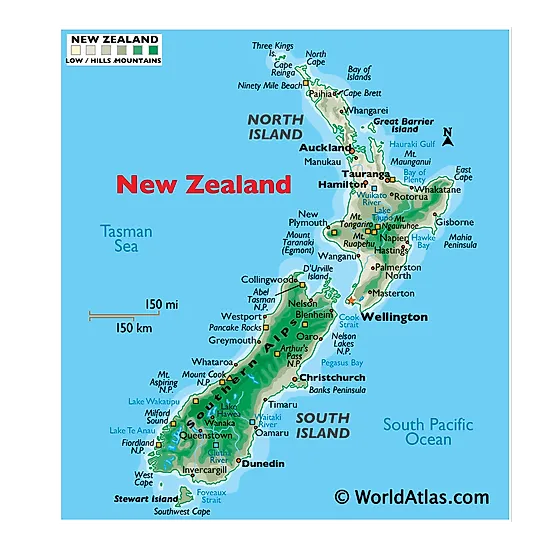 The above outline map represents New Zealand – an island country in the Southwestern Pacific Ocean.