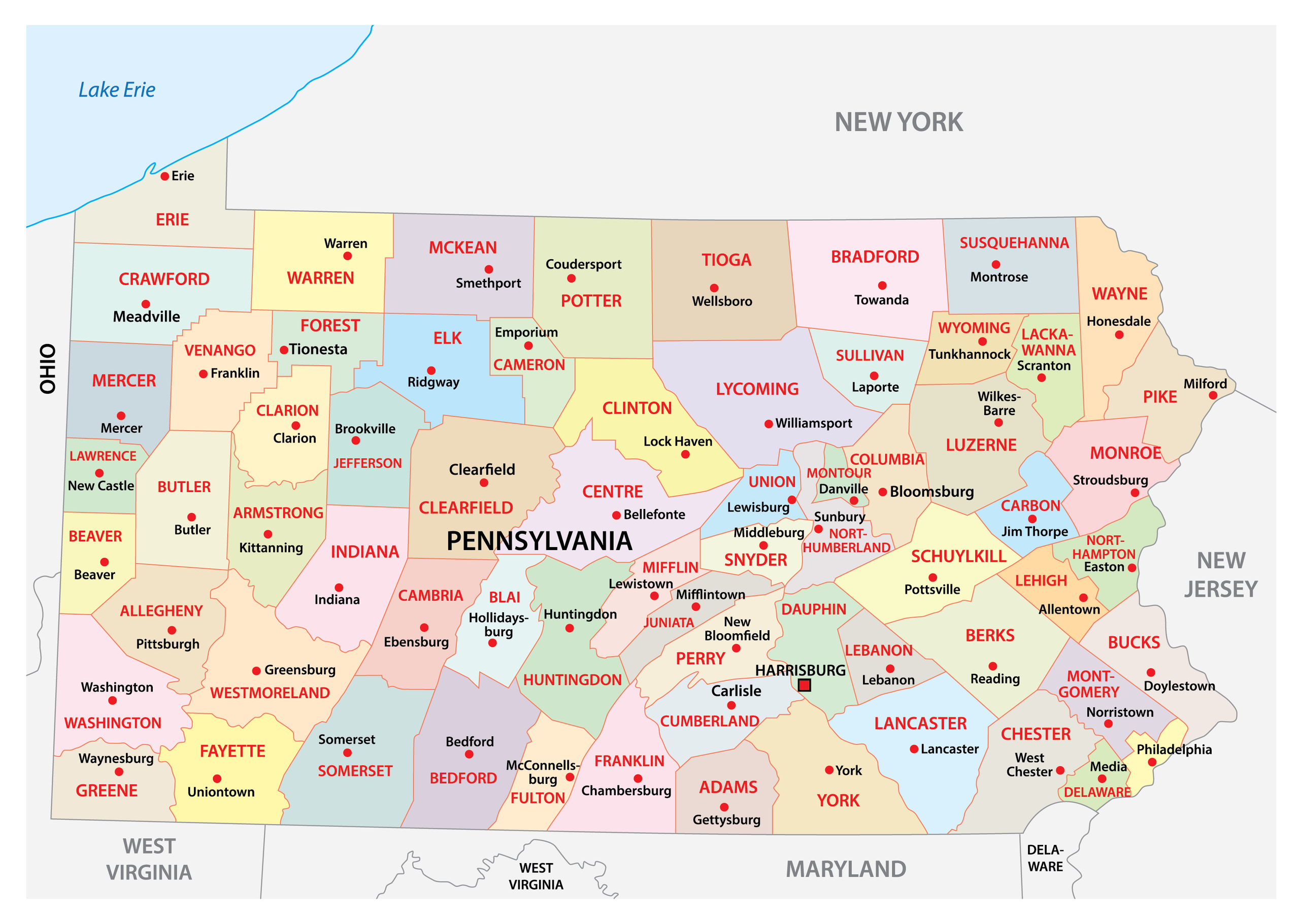 The State of Pennsylvania is divided into 67 counties. In alphabetical order, these counties are: Adams, Allegheny, Armstrong, Beaver, Bedford, Berks, Blair, Bradford, Bucks, Butler, Cambria, Cameron, Carbon, Centre, Chester, Clarion, Clearfield, Clinton, Columbia, Crawford, Cumberland, Dauphin, Delaware, Elk, Erie, Fayette, Forest, Franklin, Fulton, Greene, Huntingdon, Indiana, Jefferson, Juniata, Lackawanna, Lancaster, Lawrence, Lebanon, Lehigh, Luzerne, Lycoming, McKean, Mercer, Mifflin, Monroe, Montgomery, Montour, Northampton, Northumberland, Perry, Philadelphia, Pike, Potter, Schuylkill, Snyder, Somerset, Sullivan, Susquehanna, Tioga, Union, Venango, Warren, Washington, Wayne, Westmoreland, Wyoming, and York.