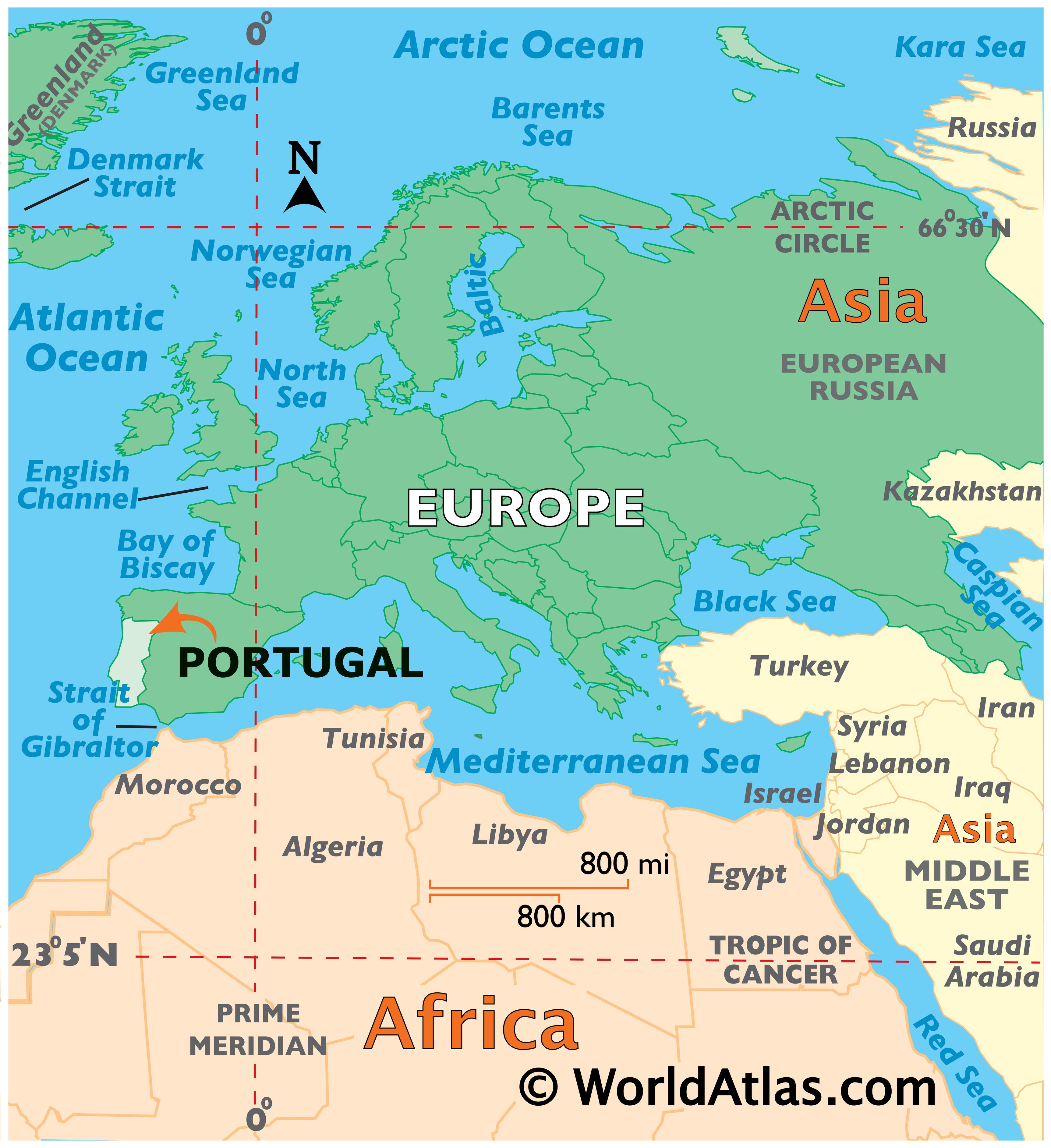 Portugal is located on the Iberian Peninsula, in South Western Europe. Portugal is geographically positioned in the Northern and Western hemispheres of the Earth. Situated in the westernmost part of Europe, Portugal is bordered by Spain in the north and east; and by Atlantic Ocean in the south and west. The small archipelagos of Azores and Madeira are in the south and southwest of Portugal in the Atlantic Ocean. Portugal shares its maritime borders with Morocco.