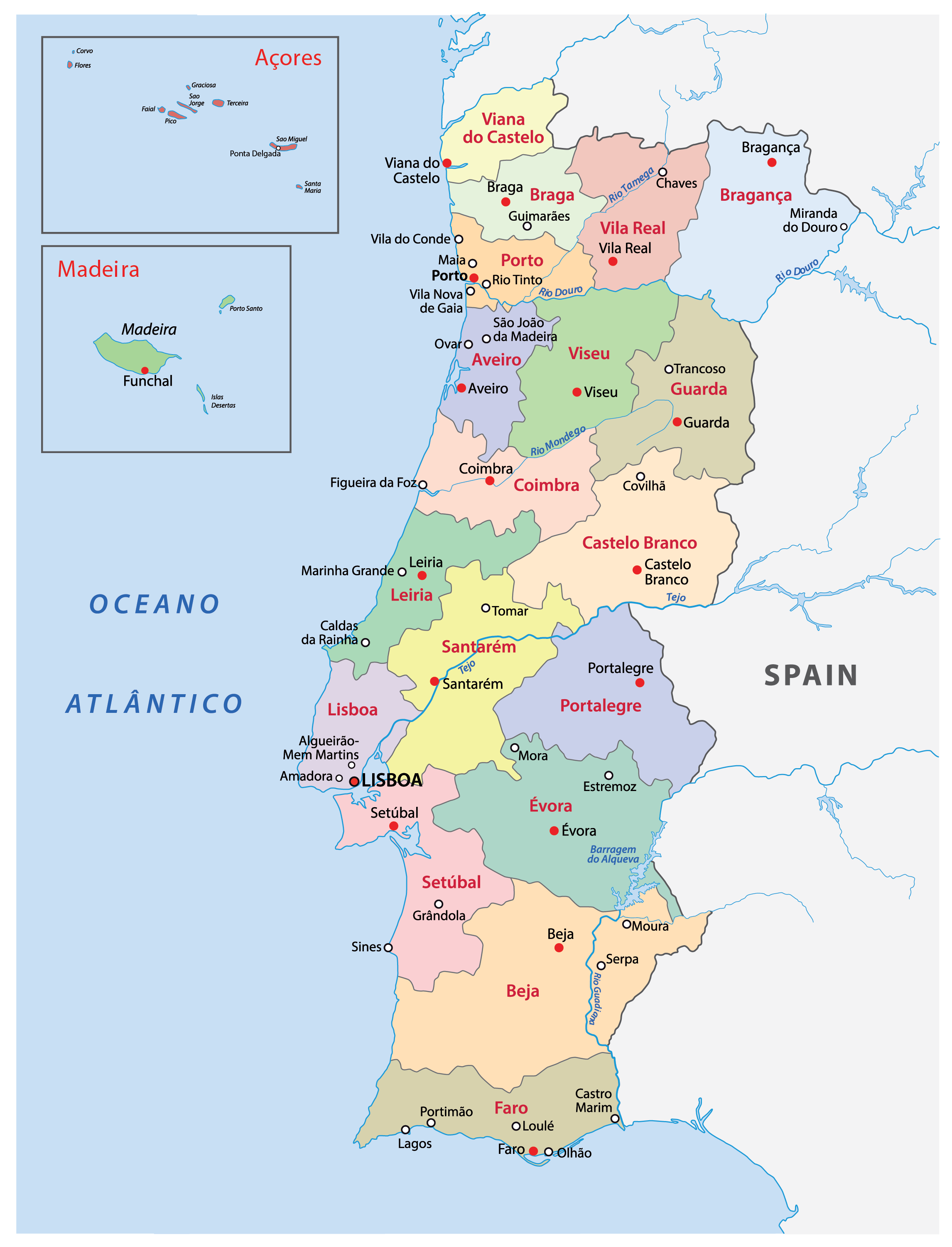 Portugal (officially, the Portuguese Republic) is divided into: 18 districts (distritos, sing. distrito) and 2 autonomous regions (regioes autonomas, sing. regiao autonoma). In alphabetical order, the districts are: Aveiro, Beja, Braga, Braganḉa, Castelo Branco, Coimbra, Evora, Faro, Guarda, Leiria, Lisboa (Lisbon), Portalegre, Porto, Santarem, Setubal, Viana do Castelo, Vila Real, and Viseu. The two autonomous regions are – Acores (Azores) and Madeira.