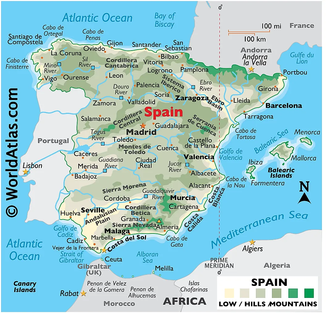 Spain Bordering Countries: Morocco, Gibraltar, Portugal, Andorra.