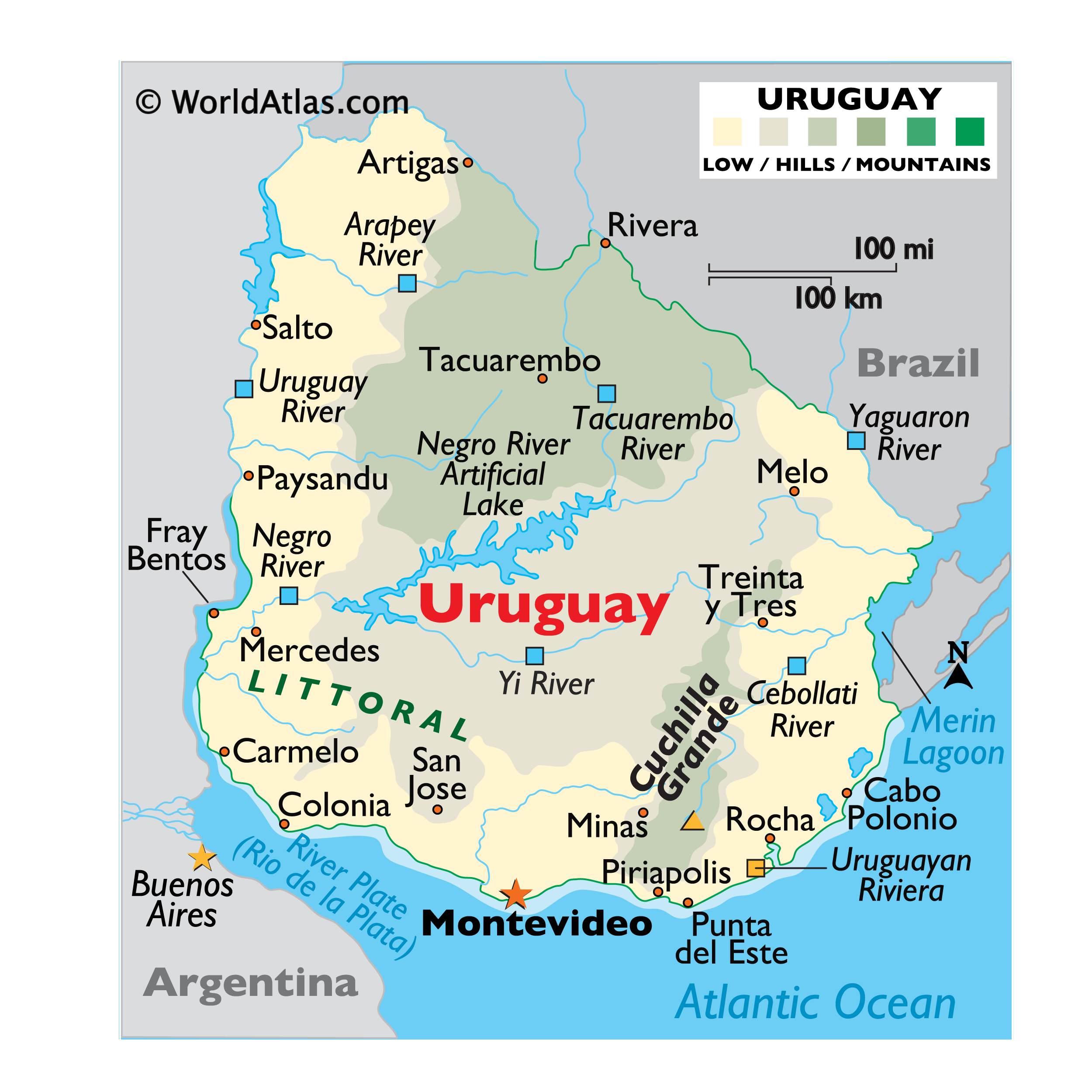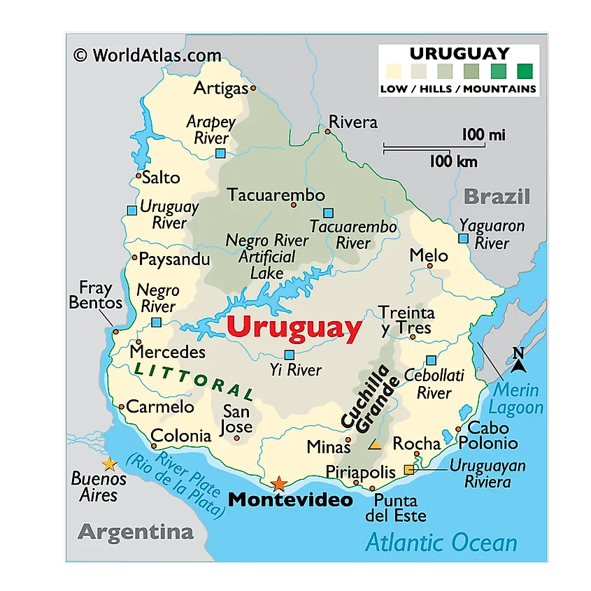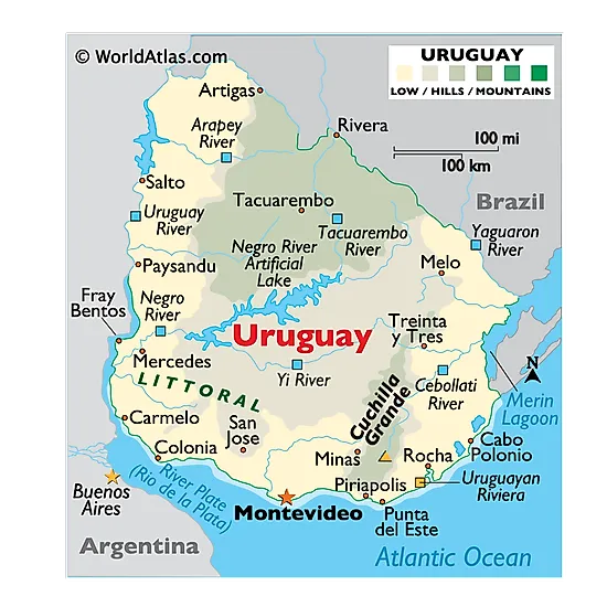 Physical Map of Uruguay showing relief, mountains, lakes, rivers, important cities, bordering countries, and more.