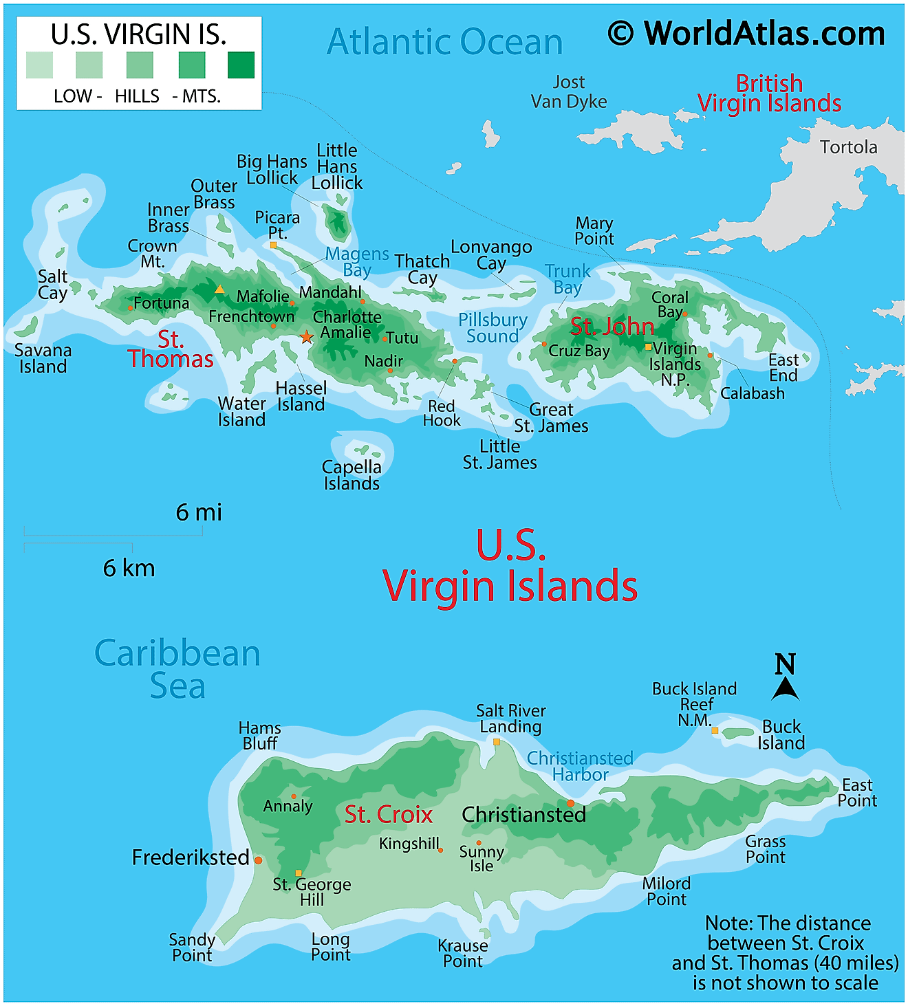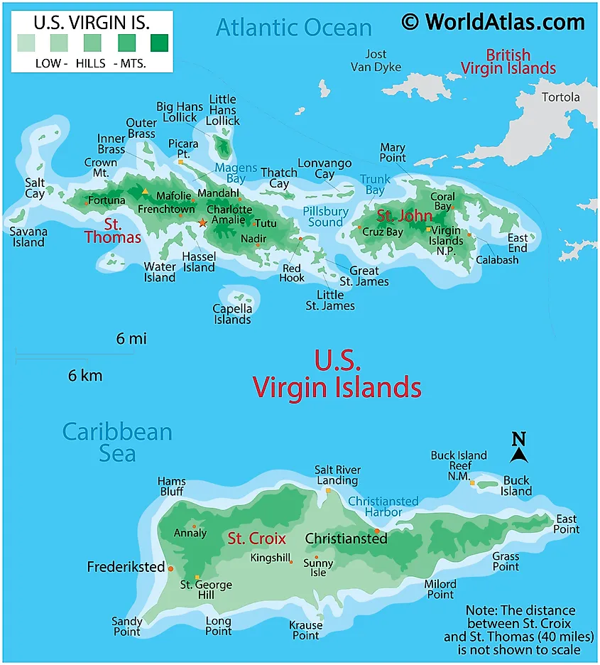 Most of the islands are volcanic in origin and as observed on the map, the islands of Saint Thomas and Saint John are quite hilly. Saint Croix is the largest of the US Virgin Islands and comparatively has a much flatter terrain.