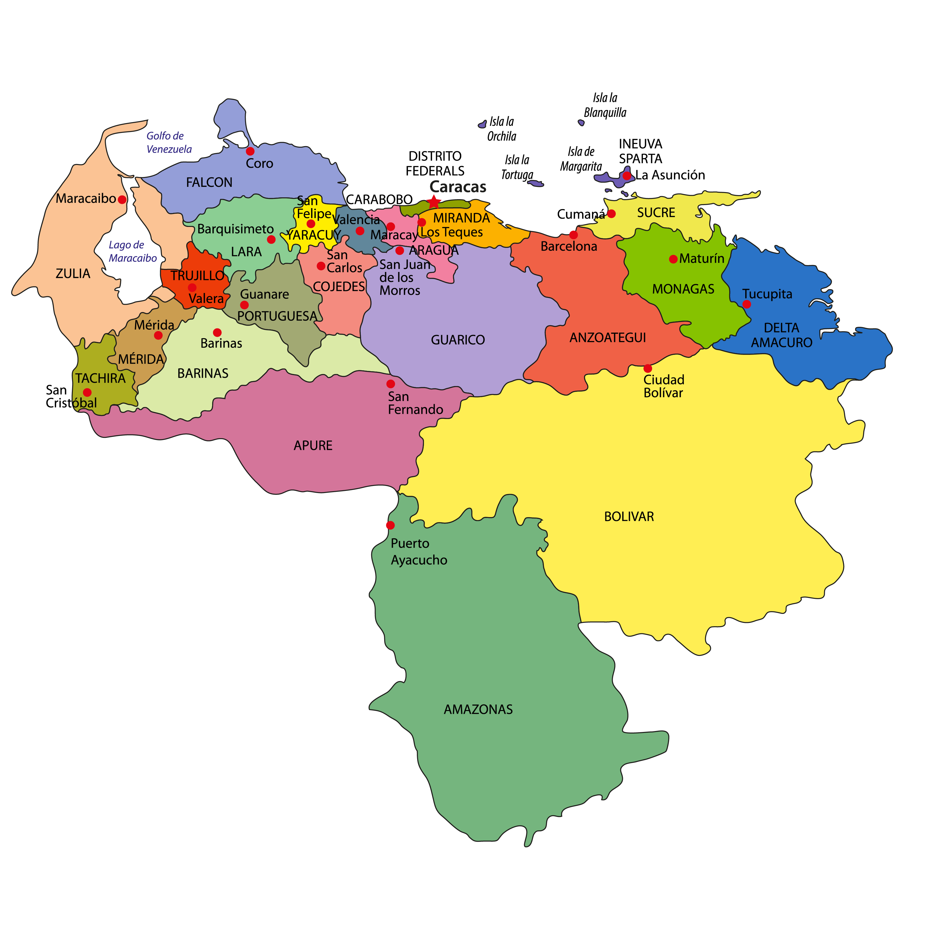 Venezuela (officially, the Bolivarian Republic of Venezuela) is divided into 23 states (estados, singular - estado), 1 Capital district (Distrito Capital), and Federal Dependencies (Dependencias Federales). In alphabetical order, the States are: Amazonas, Anzoategui, Apure, Aragua, Barinas, Bolivar, Carabobo, Cojedes, Delta Amacuro,Falcon, Guarico, Lara, Merida, Miranda, Monagas, Nueva Esparta, Portuguesa, Sucre, Tachira, Trujillo, Vargas, Yaracuy and Zulia. The country is further subdivided into a total of 335 municipalities and over 1000 parishes.The Federal Dependencies comprises of Venezuela's many offshore islands and islets in the Caribbean Sea.